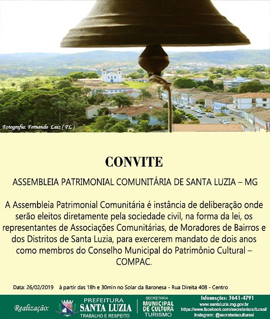 A Prefeitura de Santa Luzia, por meio da Secretaria Municipal de Cultura e Turismo, realiza a 1ª Assembleia Patrimonial Comunitária. O evento será realizado no dia 26 de fevereiro, às 18:30 horas, no Solar da Baronesa – na Rua Direita, 408, Centro.