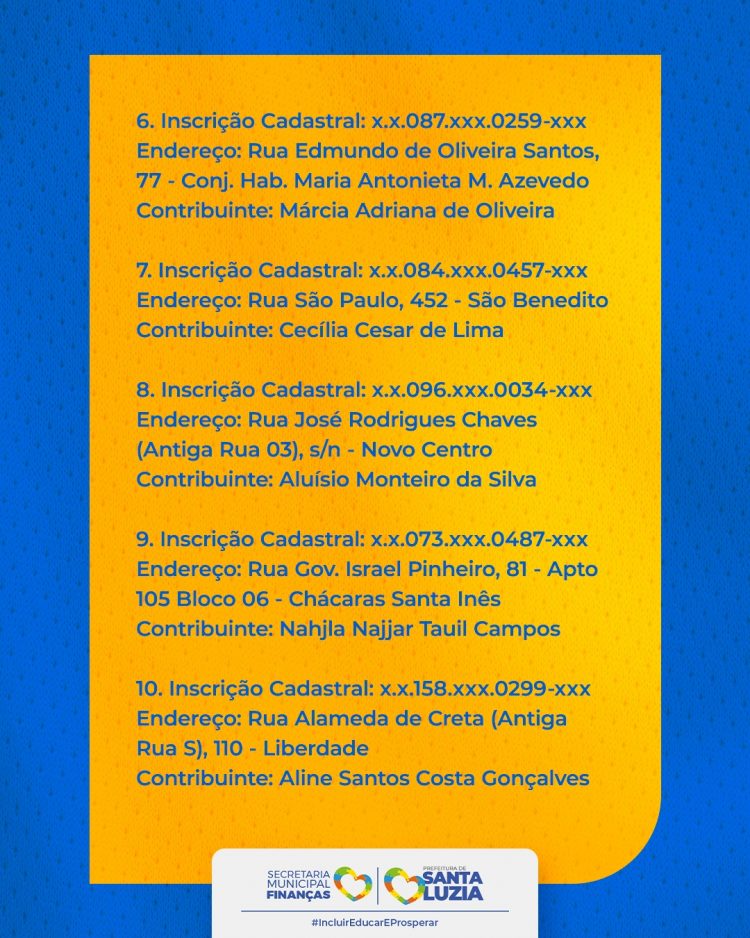Nesta primeira etapa, 10 contribuintes foram contemplados com prêmios de R$ 1.000,00 cada. Confira os nomes dos ganhadores e seus respectivos dados:
