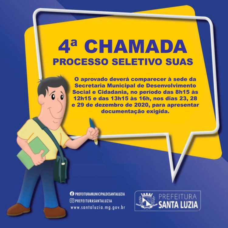 A Prefeitura de Santa Luzia convoca mais um candidato do Processo Seletivo Simplificado para o cargo de Técnico Nível Médio. A convocação foi publicada na última terça-feira (22). O aprovado deverá comparecer à sede da Secretaria Municipal de Desenvolvimento Social e Cidadania, no período das 8h15 às 12h15 e das 13h15 às 16h, nos dias 23, 28 e 29 de dezembro de 2020, para apresentar a documentação exigida.