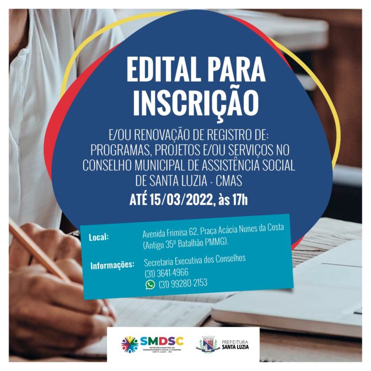A Prefeitura de Santa Luzia, por meio da Secretaria Municipal de Desenvolvimento Social e Cidadania e do CMAS – Conselho Municipal da Assistência Social de Santa Luzia informa que está aberto o edital para a inscrição ou renovação do registro de programas, projetos ou serviços de entidades legalmente constituídas, com propostas e atividades voltadas para Assistência Social. A relação de documentos está disponível no Edital 001/22 publicado no último dia (5) no Diário Oficial Eletrônico do Município.