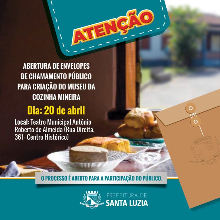 A Prefeitura de Santa Luzia, por meio da Secretaria Municipal Cultura e Turismo, informa que na próxima quarta-feira (20), a partir das 10h, serão abertos os envelopes encaminhados por Organização da Sociedade Civil (OSCs) participantes do chamamento público para criação e montagem de Museu da Cozinha Mineira, na Fazenda Boa Esperança. O chamamento é regulamento pelo edital Edital de Chamamento Público – Secult n° 001/2022.