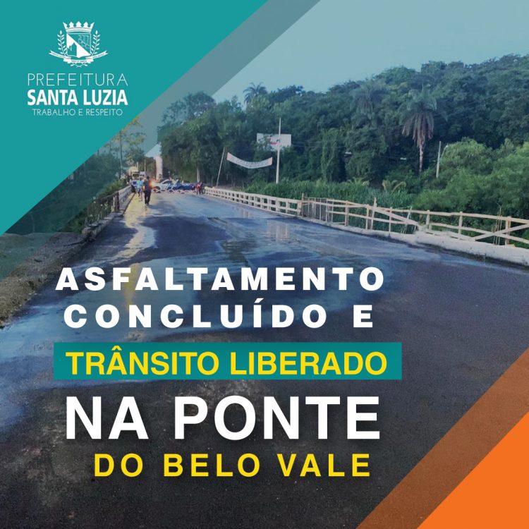 A Prefeitura de Santa Luzia informa que o trânsito na ponte da Avenida Brasília, próximo ao bairro Belo Vale, já está liberado, com a conclusão da pavimentação asfáltica no trecho que passou por recente intervenção.