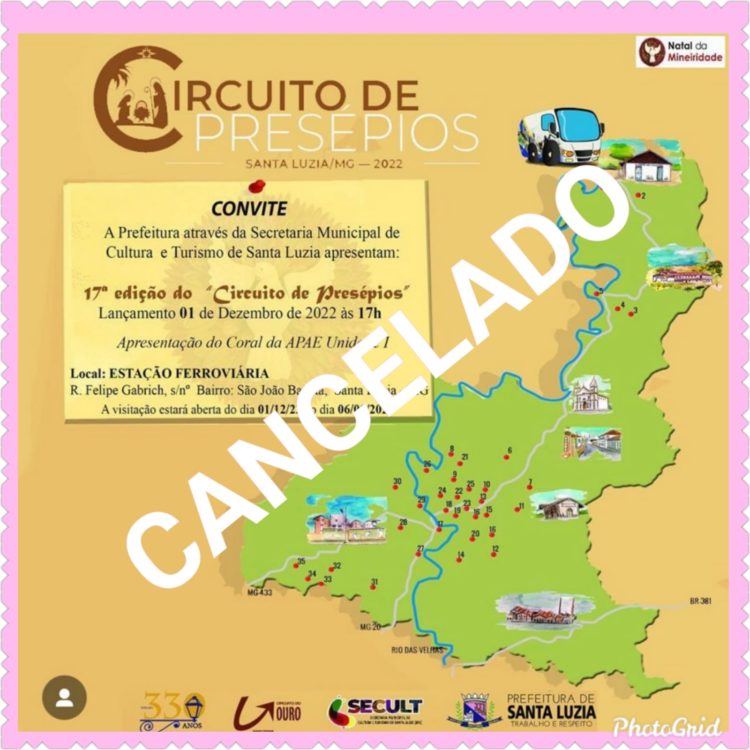 A Prefeitura de Santa Luzia, por meio da Secretaria de Cultura e Turismo, informa que, devido às fortes chuvas, o evento de inauguração do Circuito de Presépios que ocorreria hoje, às 17h, na Estação Ferroviária, foi cancelado.