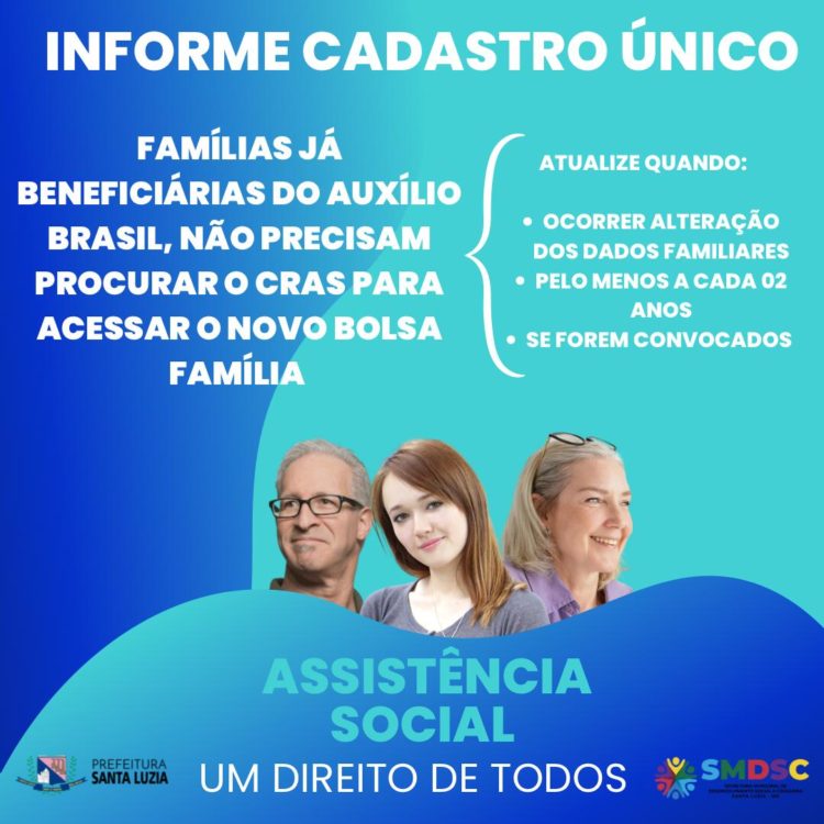 Informamos que os usuários não precisam procurar o CRAS com o objetivo de receber o novo Bolsa Família. Quem já era beneficiário do Auxílio Brasil, somente deverá atualizar o cadastro quando convocado, se houver alterações nos dados familiares e a cada 02 anos.