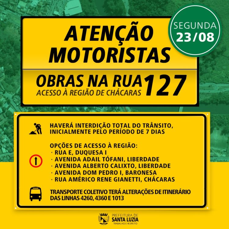 Na próxima segunda-feira (23), a Companhia de Saneamento de Minas Gerais (Copasa) iniciará obras de drenagem pluvial na rua 127, acesso a região de Chácaras. Em função disso, haverá interdição total do trânsito na referida via, inicialmente pelo período de sete dias.