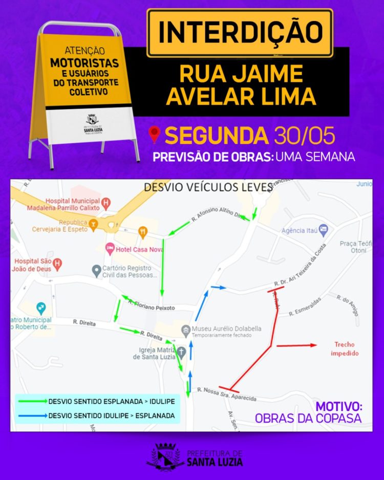 Em função de obras da COPASA a serem realizadas pela Construtora Rocha Oliveira Ltda., no bairro Idulipê, o trânsito na Rua Jaime Avelar Lima ficará impedido no trecho entre a Rua Nossa Senhora da Conceição e Rua Dr. Ari Teixeira da Costa a partir da segunda-feira (30). De acordo com o cronograma, a previsão é que as intervenções durem uma semana.