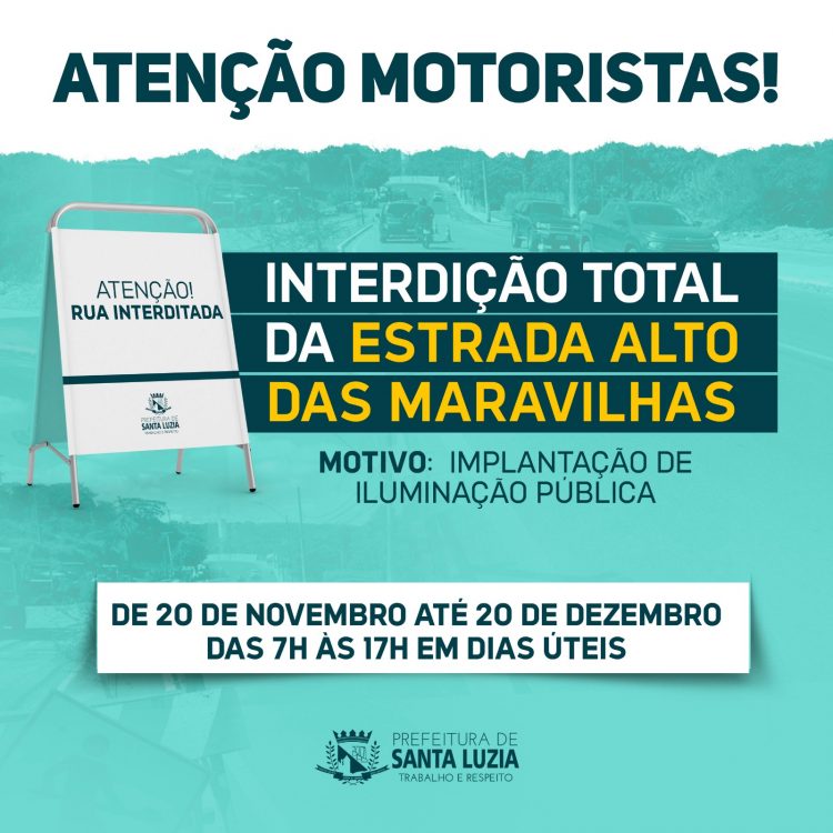 A Prefeitura de Santa Luzia informa que a Estrada Alto das Maravilhas será interditada a partir da segunda-feira (20) até o dia 20 de dezembro, das 7h às 17h. A medida se faz necessária para a instalação de postes para a implantação da iluminação pública no trecho que se inicia na rotatória da mangueira até o Mirante Alto das Maravilhas. Os serviços serão executados apenas em dias úteis.
