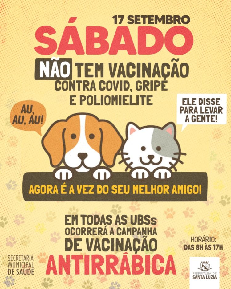 A Prefeitura, por meio da Secretaria Municipal de Saúde, informa que no próximo sábado (17), não haverá vacinação contra a covid-19, gripe e poliomielite nas unidades básicas de saúde (UBS) Caribé e São Geraldo. O motivo é a Campanha de Vacinação Antirrábica, que acontecerá nesta data, em todas as UBS’s do município. A cronograma semanal será retomado na próxima semana, no sábado (24).