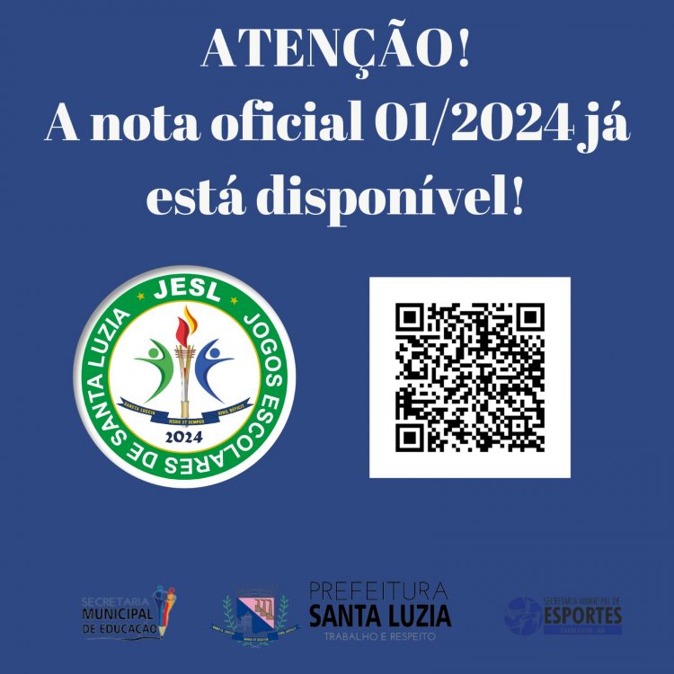 A prefeitura, por meio da secretaria municipal de esporte e lazer informa que a nota oficial 01/2024 dos Jogos Escolares de Santa Luzia já está disponível!