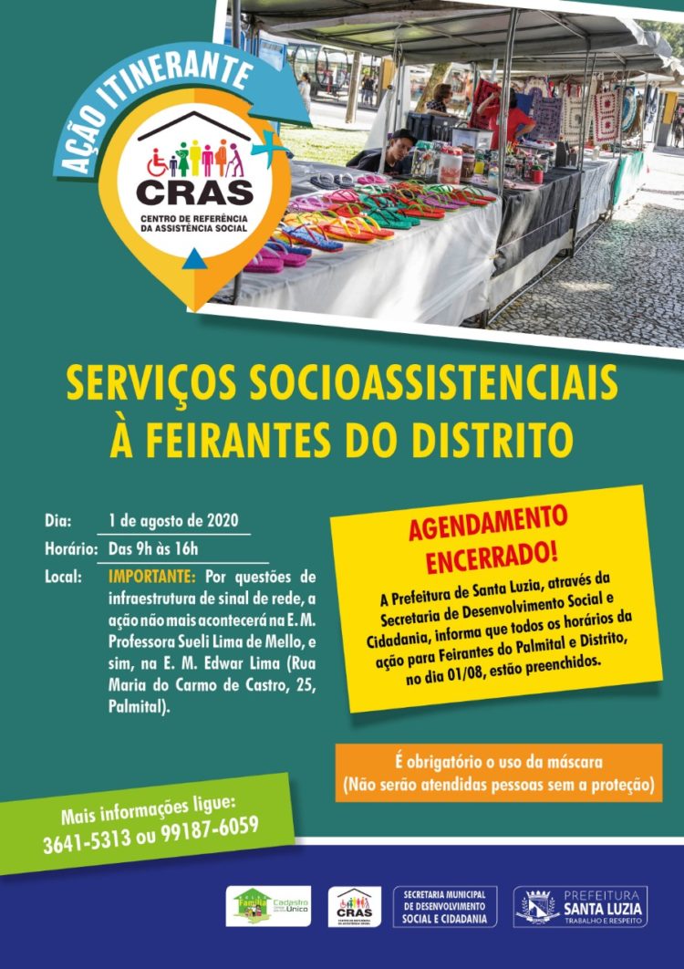 A Prefeitura de Santa Luzia, através da Secretaria de Desenvolvimento Social e Cidadania, informa que todos os horários da ação para Feirantes do Palmital e Distrito, no dia 01de agosto, estão preenchidos.