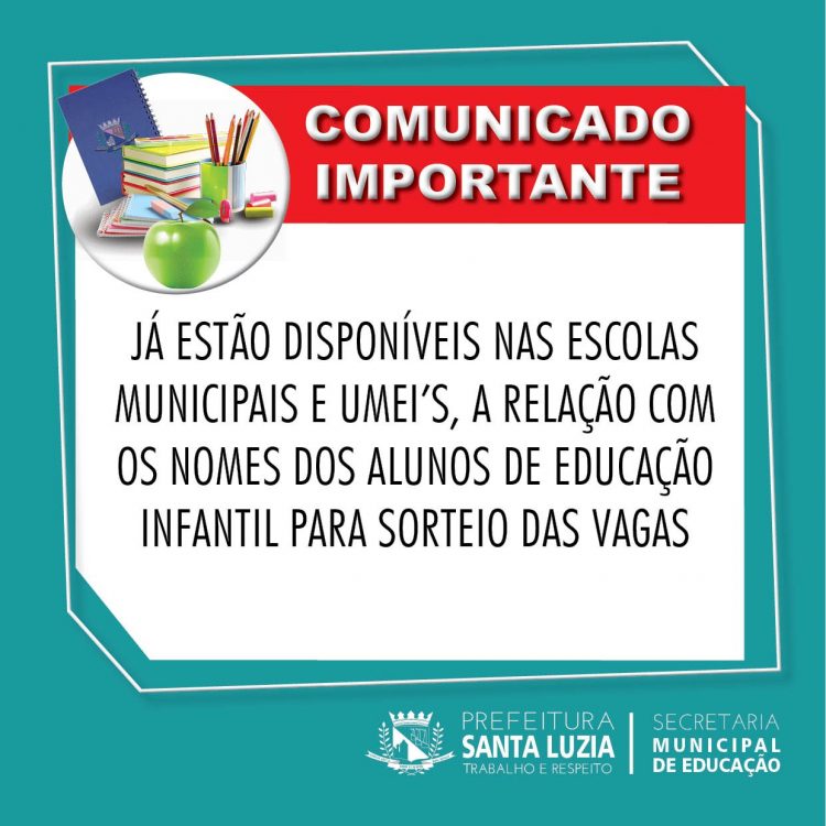 A Secretaria Municipal de Educação informa que já estão disponíveis nas escolas municipais e UMEI’s, a relação com os nomes dos alunos de Educação Infantil para sorteio das vagas nos dias 2, 3 e 4 de janeiro de 2019.