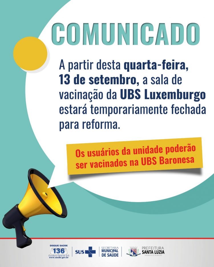 A Prefeitura de Santa Luzia, por meio da Secretaria Municipal de Saúde, informa que a sala de vacinas da unidade básica de saúde Luxemburgo está temporariamente fechada para realização de uma pequena reforma. Os usuários da unidade poderão se vacinar na unidade básica de saúde Baronesa, que fica na rua Holanda, 100 – Bairro Baronesa.
