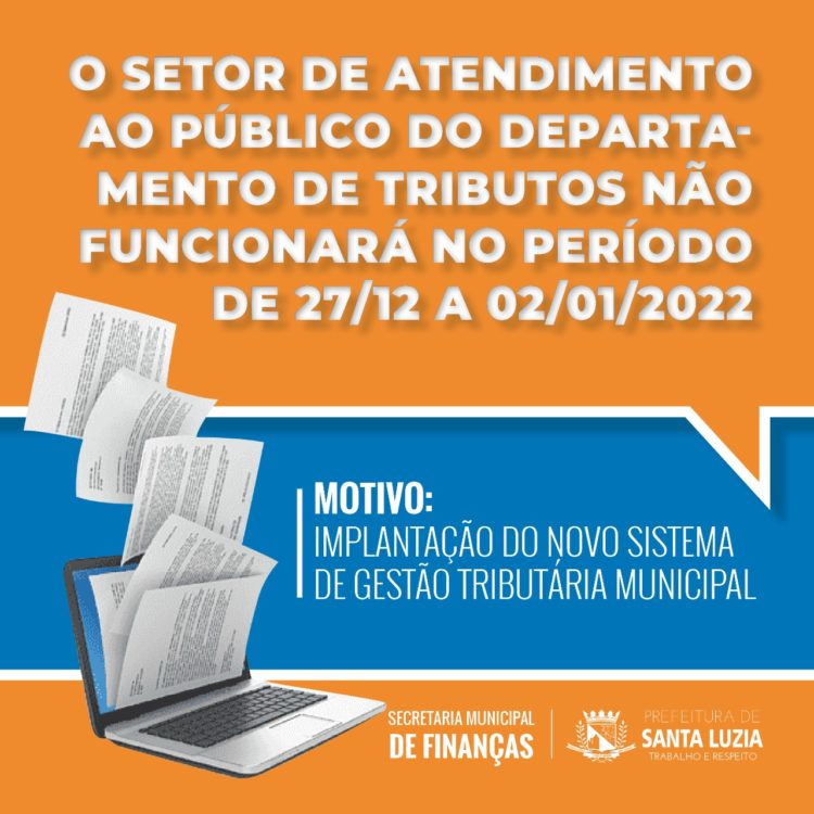 A Secretaria Municipal de Finanças informa que o acesso ao Sistema de Tributação Municipal estará indisponível do dia 27 de dezembro ao dia 2 de janeiro de 2022, devido à manutenção técnica tendo em vista a implantação do novo Sistema de Gestão Tributária Municipal, que entrará em operação a partir do dia 3/01/2022.