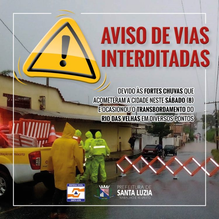A Prefeitura de Santa Luzia, por meio da Defesa Civil Municipal informa que devido às fortes chuvas que acometeram a cidade neste sábado (8) e ocasionou o transbordamento do Rio das Velhas em diversos pontos do município foi necessária, como medida de segurança a interdição de alguns pontos que apresentam nível de trasbordamento do Rio. São eles: Avenida Beira Rio sentido Sabará, logo após a Ponte Nova e no sentido Santa Luzia, próximo a Rua Duque de Caxias, no acesso ao bairro Córrego das Calçadas; Avenida Raul Teixeira da Costa nos fundos do bairro Boa Esperança, altura do acesso ao bairro Pantanal e interdição total no cruzamento com Rua Redelvim de Andrade, no bairro Boa Esperança; Avenida Pres. Venceslau Brás, (atrás do posto Beira Rio) totalmente interditada e Morro do Vesper. Possivelmente a Ponte Velha poderá ser interditada, caso o nível do Rio das Velhas continue elevado. A Defesa Civil segue monitorando as áreas de risco e nível do Rio das Velhas. O órgão recomenda que a população siga as normas de segurança e evitem transitar em pontos de alagamento durante o período chuvoso.