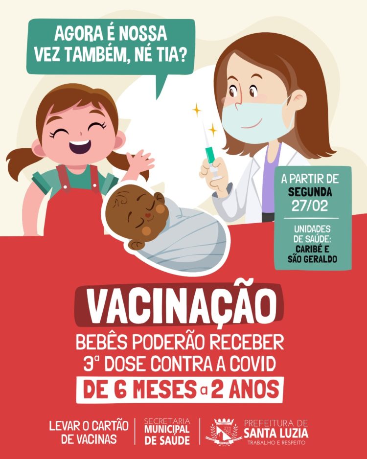 A Prefeitura, por meio da Secretaria Municipal de Saúde, disponibilizará a partir da próxima segunda-feira (27), a terceira dose da vacina contra a covid-19 para crianças de 6 meses a 2 anos. A aplicação acontece nas unidades básicas de saúde Caribé e São Geraldo, das 9h às 16h. Para se vacinar com a terceira dose, é necessário que o bebê tenha se imunizado com a segunda há, no mínimo, dois meses.