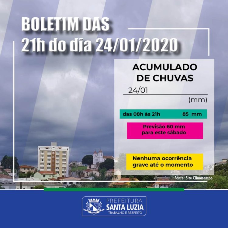 As chuvas que caíram de quarta feira à noite até agora já foram consideradas a maior do último século e só não causou maiores problemas em Santa Luzia em razão da prevenção realizada e mobilização de grande aparato público. Durante a tarde desta sexta-feira (24), as chuvas deram uma trégua no município de Santa Luzia, no período entre às 16h e 20h, especificamente, mas voltou a cair forte no início das 21 horas.