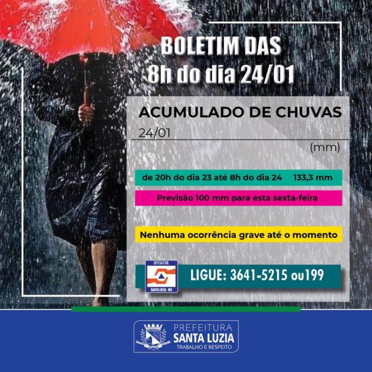 A Prefeitura de Santa Luzia, por meio da Defesa Civil informa que durante a noite já choveu aproximadamente 133,3 mm no município, chuva de força média/alta e constante. A previsão de hoje é chover ainda por volta de 100mm, o que somado há aproximadamente 200 mm que choveu desde quarta feira à noite vão chegar a um volume de 300 mm, além até do alto volume que estava previsto. Devido ao grande volume de águas, a ponte velha, próximo à Rua do Comércio foi interditada por medida de segurança e sem previsão no momento para a reabertura.