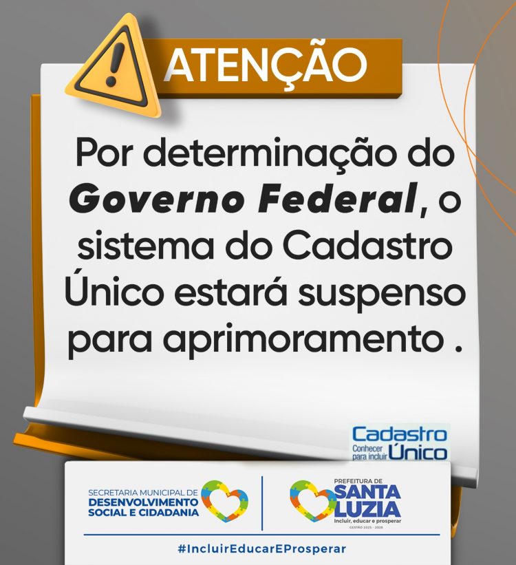 Entre os dias 6 e 14 de março, o sistema do Cadastro Único passará por uma atualização determinada pelo Governo Federal, o que resultará na suspensão temporária dos serviços. Durante esse período, não haverá cadastramento ou atualização de dados nos postos de atendimento dos CRAS em Santa Luzia.