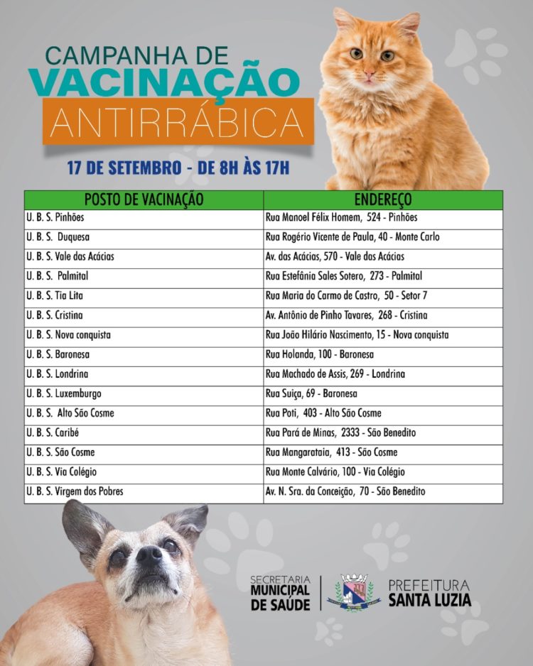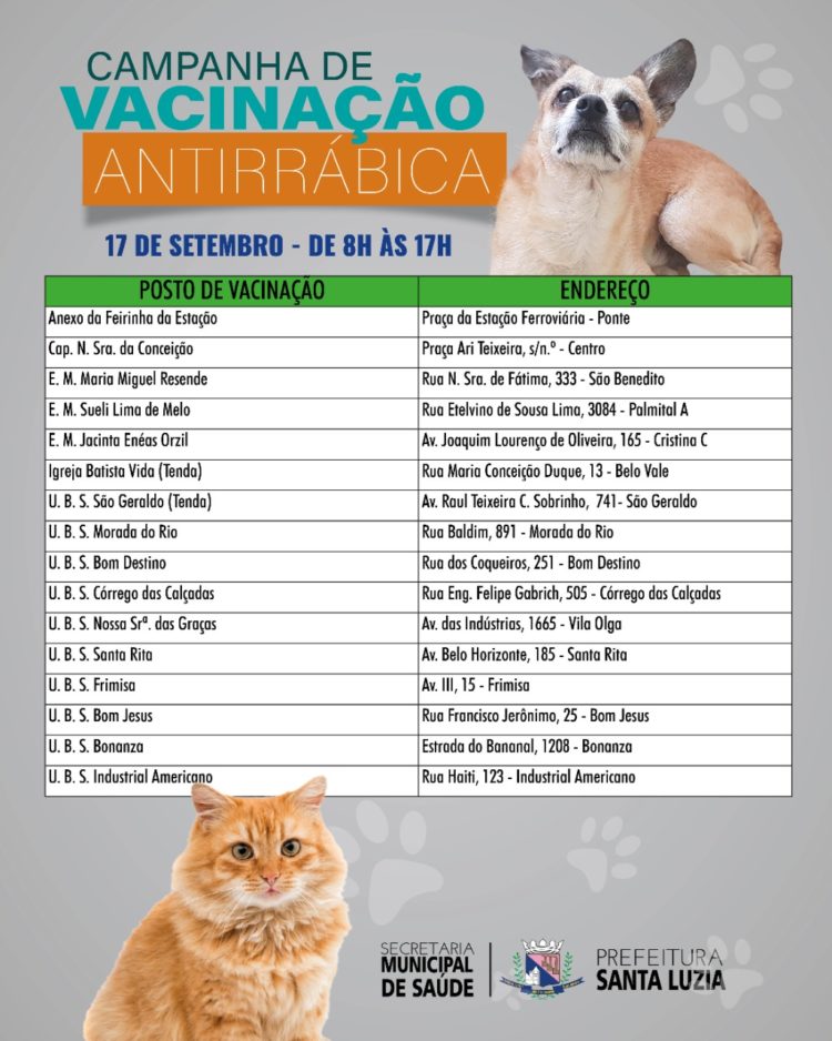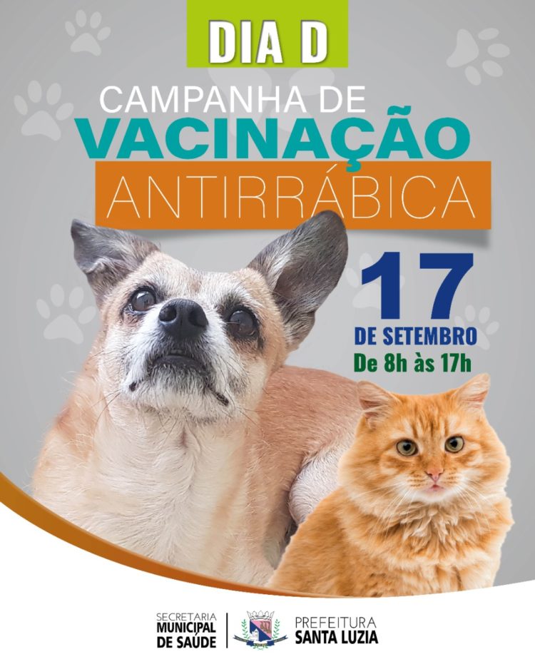 A campanha de vacinação antirrábica de cães e gatos em Santa Luzia irá acontecer no dia 17 de setembro, das 8h às 17h, em todas as unidades básicas de saúde (UBS) do município e em seis pontos de vacinação. Os animais a partir de três meses de idade deverão receber a dose única anual da vacina, que previne contra a raiva. A doença apresenta alta letalidade, tanto para animais, quanto para humanos. É importante reforçar que os tutores levem animais bravos com focinheiras de proteção e deverão conter seus animais na hora da vacinação. Gatos deverão ser levados na caixa de transporte.