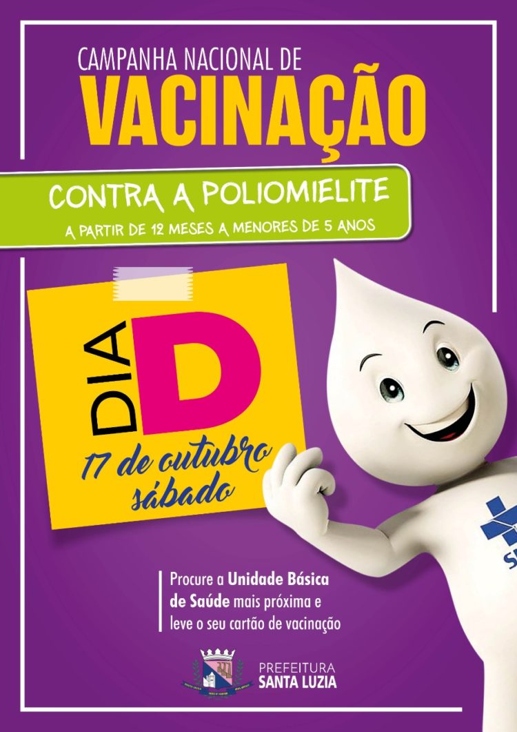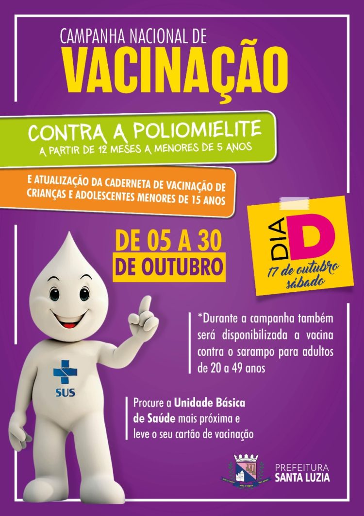 Começa nesta segunda-feira (05), a Campanha Nacional de Vacinação contra a Poliomielite e Multivacinação para atualização da caderneta de vacinação de crianças e adolescentes menores de 15 anos. As campanhas serão realizadas até o dia 30 de outubro, sendo 17 de outubro, o dia de divulgação e mobilização nacional (Dia D). Também será ofertada a vacina contra o Sarampo, para adultos de 20 a 49 anos de idade. A Campanha contra a Poliomielite tem como público-alvo crianças a partir de 12 meses a menores de 5 anos de idade.