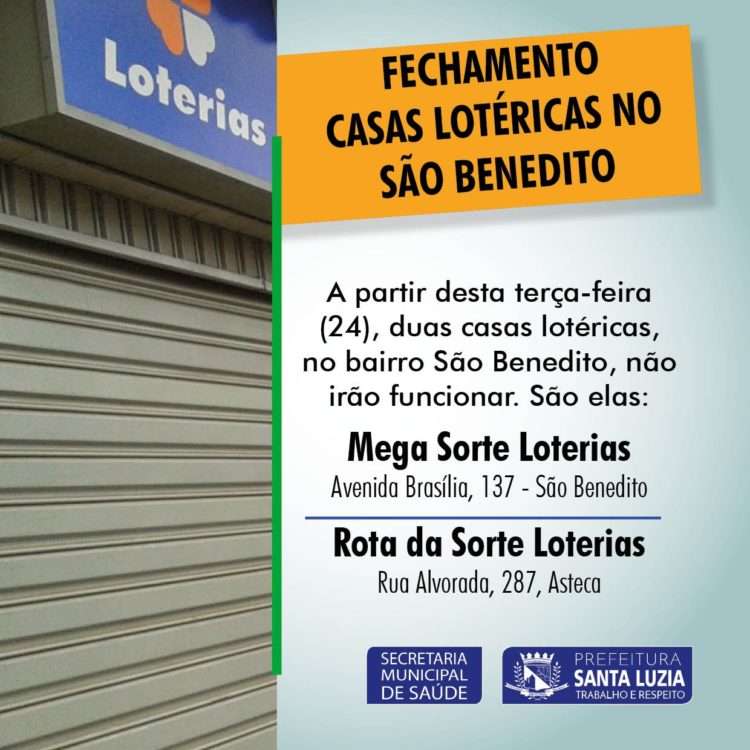 A Prefeitura de Santa Luzia informa que a partir desta terça-feira (24), duas casas lotéricas localizadas no distrito de São Benedito não irão funcionar. O motivo do fechamento se deve a medidas preventivas adotadas para controlar a disseminação e contágio pelo novo Coronavírus (Covid-19), no município. Mesmo sem o munícipio ter autonomia para fechar este tipo de estabelecimento, os empresários do setor se sensibilizaram com o momento de enfrentamento de crise e controle da doença em santa Luzia e decidiram fechar as portas por tempo indeterminado. Até o momento o município não tem informações se outras casas lotéricas na cidade também irão atender ao pedido da Prefeitura e fechar as portas. Confira o endereço dos estabelecimentos que serão fechados a partir e amanhã: Mega Sorte Loterias, situada na Avenida Brasília, 137 – São Benedito e Rota da Sorte Loterias, que fica na Rua Alvorada, 287, bairro Asteca.