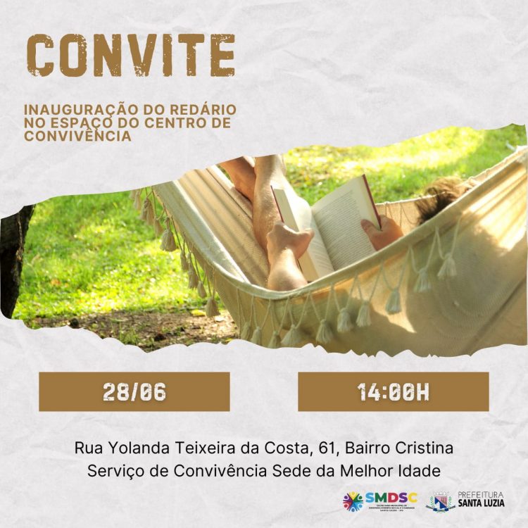A Prefeitura de Santa Luzia, através da Secretaria de Desenvolvimento Social e Cidadania, por meio do Centro de Convivênia /Sede da Melhor Idade, localizada na Av. Yolanda Teixeira da Costa, 61, Cristina, irá inaugurar no dia 28 de Junho, às 14h, o “Redário Cantinho do Sossego”, um espaço confortável com redes, onde as pessoas podem relaxar.