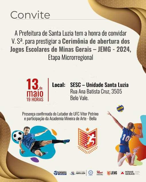 A Prefeitura de Santa Luzia, através da Secretaria Municipal de Esporte e Lazer, tem a honra de convidar a todos para a cerimônia de abertura da etapa microrregional dos Jogos Escolares de Minas Gerais – JEMG 2024.