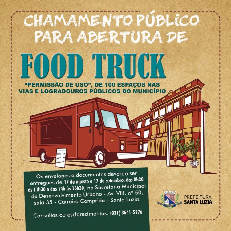 A Prefeitura de Santa Luzia está abrindo chamamento público, para “Permissão de Uso”, de 100 espaços, destinados para alimentação na modalidade “FOOD TRUCK”, nas vias e logradouros públicos do município, observados os critérios e as disposições instituídas na Lei 3.787/2016.