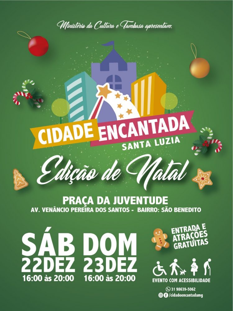 O Natal se aproxima e junto com a data o sentimento de alegria se aflora. E já em clima de festas que o “Cidade Encantada” chega a Santa Luzia. O evento acontecerá no sábado (22) e domingo (23), das 16 às 20 horas. Na programação, completamente gratuita, haverá shows, teatros, atividades recreativas e oficinas culturais para todas as idades. O projeto “Cidade Encantada” será integrado ao Projeto “Cidade Luz Santa Luzia”, que já está acontecendo na Praça da Juventude, desde o dia 08 de Dezembro, com programação até o dia 06 de Janeiro de 2019.