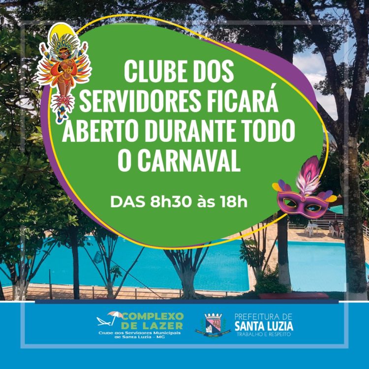 O Clube dos Servidores Municipais de Santa Luzia, no bairro Chácaras, estará em pleno funcionamento durante todo o carnaval, de sábado a terça-feira, das 8h30 às 18h. Todos os servidores municipais – efetivos, comissionados, pensionistas e terceirizados (neste caso os funcionários da empresa DDS, que deverão apresentar o último contracheque) – são bem-vindos e estão convidados a conhecê-lo e frequentá-lo em companhia de seus cônjuges e filhos. O clube, que tem mais de 15 mil m2, dispõe de amplo espaço arborizado, piscinas para adultos e crianças, campo de futebol, quadras de vôlei e tênis, playground, quiosques e um restaurante que no momento encontra-se temporariamente fechado. Também estão disponíveis saunas e vestiários.