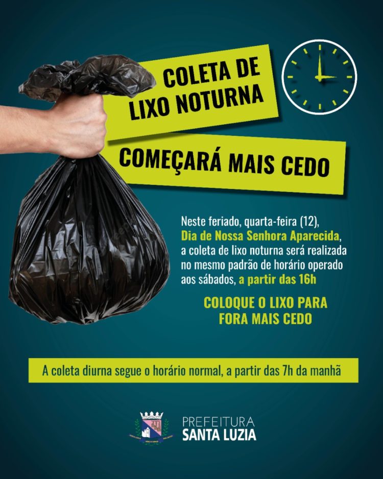 A Superintendência de Limpeza Pública da Secretaria Municipal de Obras de Santa Luzia informa que, neste feriado, quarta-feira (12), Dia de Nossa Senhora Aparecida, a coleta de lixo noturna será realizada no mesmo padrão de horário operado aos sábados, a partir das 16h. Assim, para o bom andamento do serviço, a Prefeitura solicita que os moradores dos bairros que tiverem coleta sendo realizada que coloquem o lixo para fora mais cedo.