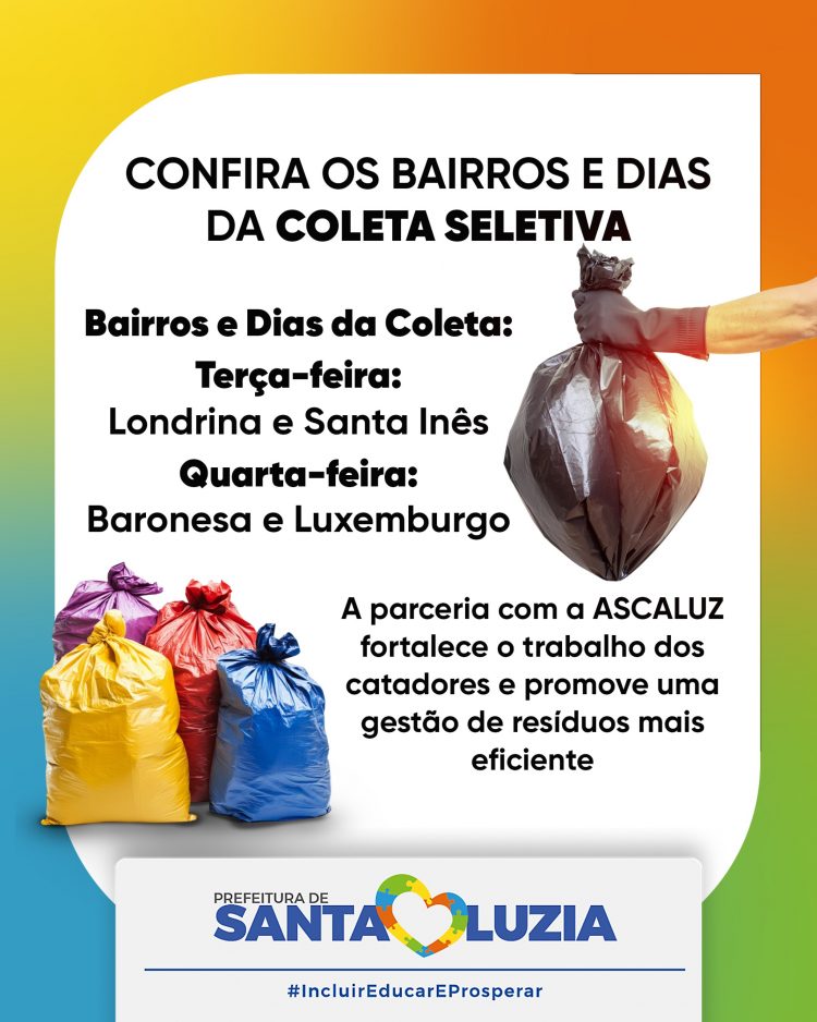 A Prefeitura de Santa Luzia, em parceria com a ASCALUZ (Associação de Catadores de Material Reciclável), segue promovendo a coleta seletiva em diversos bairros da cidade. Essa iniciativa contribui para a sustentabilidade, reduzindo impactos ambientais e fortalecendo a economia circular.