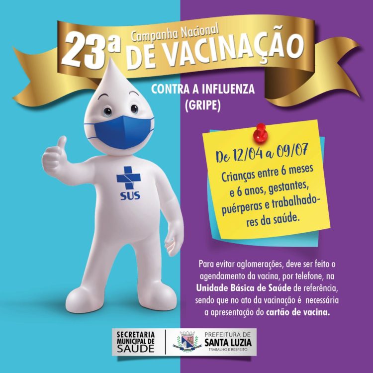 A Prefeitura de Santa Luzia, por intermédio da Secretaria de Saúde, informa que será iniciada nesta segunda-feira (12) a 23ª Campanha Nacional de Vacinação contra a influenza (gripe). A vacina contra a influenza é uma das medidas de proteção mais importantes para se proteger da doença e, além de contribuir para a redução da circulação viral na população, também irá auxiliar na redução dos sintomas que podem ser confundidos com os da covid-19. A transmissão ocorre principalmente de pessoa para pessoa, por meio de gotículas respiratórias produzidas por tosse, espirros ou fala de uma pessoa infectada para outra suscetível.