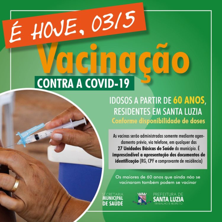 A partir desta segunda-feira (3), a prefeitura de Santa Luzia, por meio da secretaria municipal de Saúde deu início à vacinação a um novo grupo prioritário: idosos a partir de 60 anos. Com o objetivo de evitar aglomerações, estas vacinas serão administradas somente mediante agendamento prévio, via telefone, em qualquer das 27 Unidades Básicas de Saúde do município. Para receber o imunizante, é imprescindível a apresentação dos documentos de identificação (RG, CPF e comprovante de residência, original e xerox). Os maiores de 60 que porventura não tenham ainda se vacinado devem, da mesma forma, agendar sua vacina. A expectativa da secretaria municipal de Saúde é vacinar com a primeira dose todo esse grupo no decorrer desta semana.