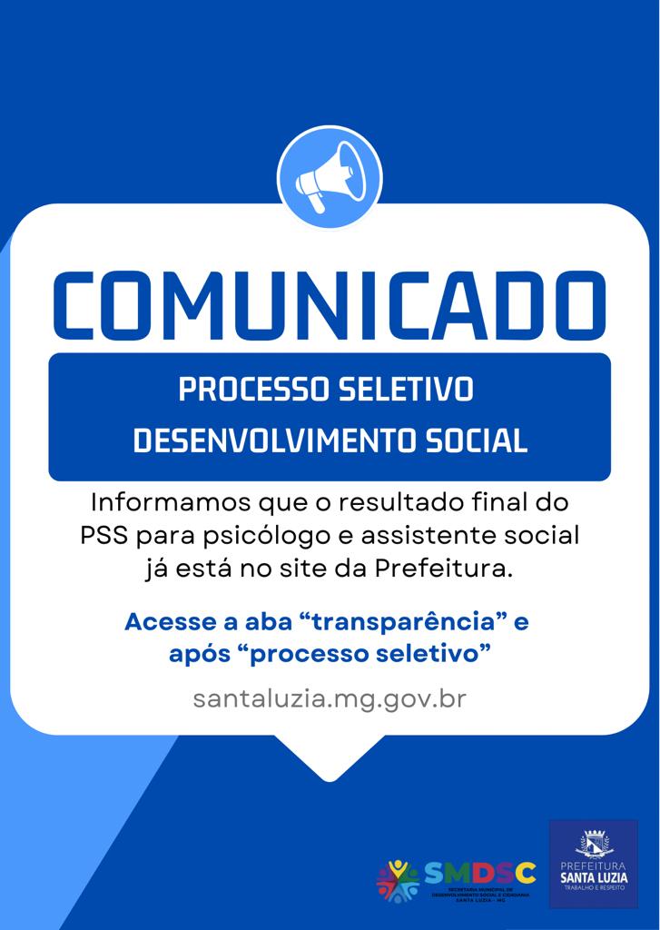 A Prefeitura por meio da Secretaria Municipal de Desenvolvimento Social e Cidadania informa que o resultado final do Processo Seletivo para psicólogo e assistente social já se encontra no site da Prefeitura.