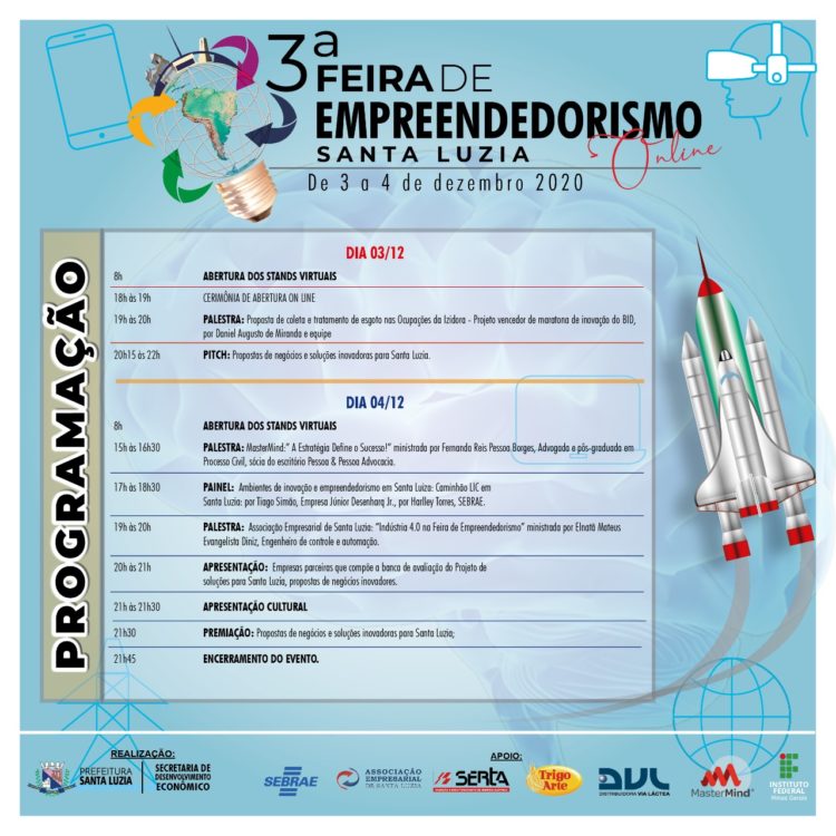 Notícia 30 de novembro de 2020 Confira a programação da 3ª Feira do Empreendedorismo do município de Santa Luzia. Anterior Prefeitura realizará ação para auxílio socioassistencial à… Próxima Em 1º de dezembro é celebrado o…