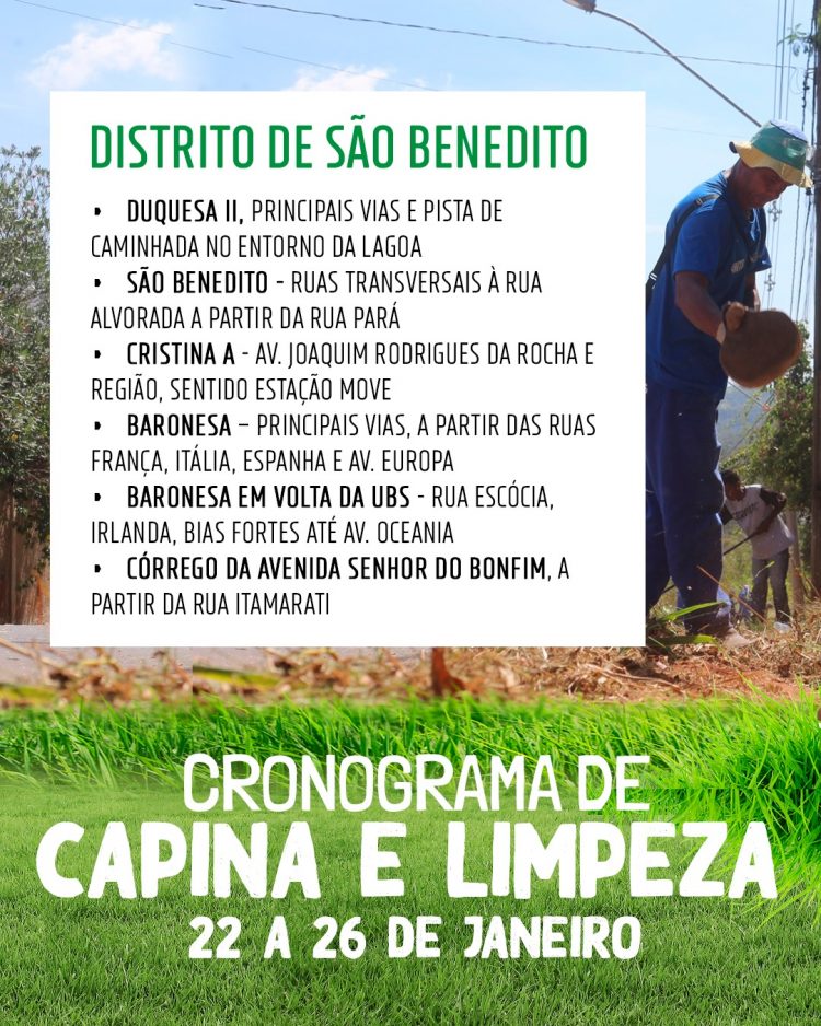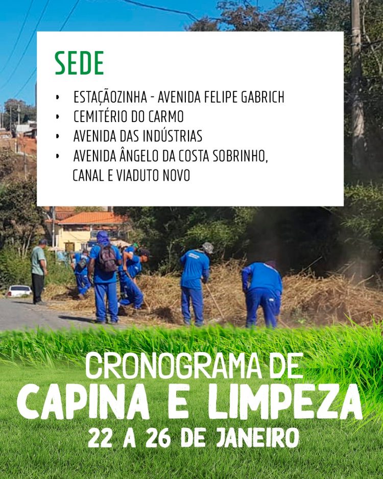 A Prefeitura de Santa Luzia está intensificando os serviços de capina e limpeza em toda a cidade. Nesta segunda-feira (22), equipes estão dedicadas à limpeza na Sede e no Distrito de São Benedito. Na Sede, as equipes atuam na Avenida Felipe Gabrich, na Estaçãozinha e no Cemitério do Carmo. Na região de São Benedito, os trabalhos estão sendo realizados nas ruas transversais à Alvorada, a partir da Rua Pará, e nas principais vias do bairro Duquesa II, além da pista de caminhada ao redor da lagoa.