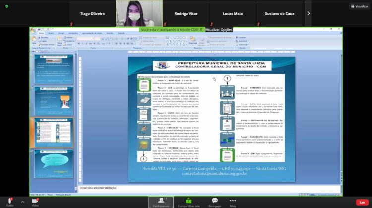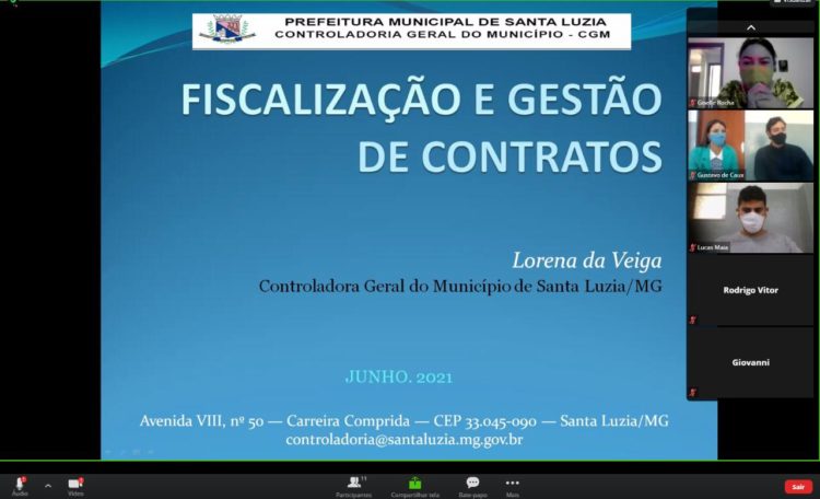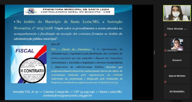 A Controladoria Geral do Município de Santa Luzia, está promovendo capacitação junto aos servidores públicos designados para exercerem a função de fiscais de contratos. A capacitação teve início no dia 16 de junho de 2021 e, devido a pandemia da Covid-19, está sendo realizada ‘’online’’ na modalidade à distância, sendo ministrada pela Controladora Geral Lorena da Veiga.