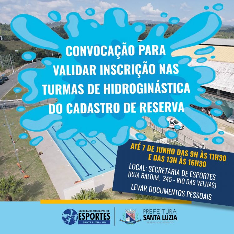A Prefeitura Municipal de Santa Luzia, por meio da Secretaria Municipal de Esportes, convoca os inscritos no cadastro de reserva para preencher as vagas remanescentes nas turmas de hidroginástica do Programa Esporte Para Todos. Os convocados têm até sexta-feira, dia 07 de junho, para validar a inscrição pessoalmente na Secretaria Municipal de Esportes de Santa Luzia, localizada no Ginásio Poliesportivo, na Rua Baldim, 345, bairro Rio das Velhas.