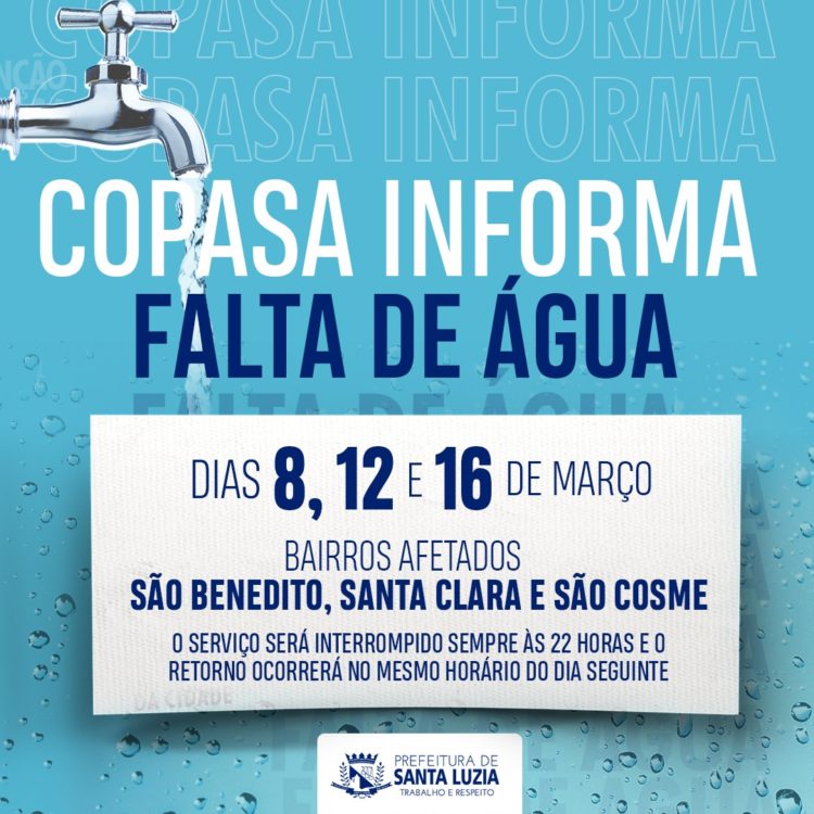 A Prefeitura de Santa Luzia informa que haverá paralisação no abastecimento de água nos dias, 8 (terça-feira), 12 (sábado) e 16 (quarta), devido ao rompimento de uma adutora da Copasa – Companhia de Saneamento de Minas Gerais em Juatuba. Portanto, haverá rodízio do abastecimento em diversas cidades da região metropolitana, entre elas Santa Luzia. O serviço será interrompido sempre às 22 horas e o retorno ocorrerá no mesmo horário do dia seguinte.