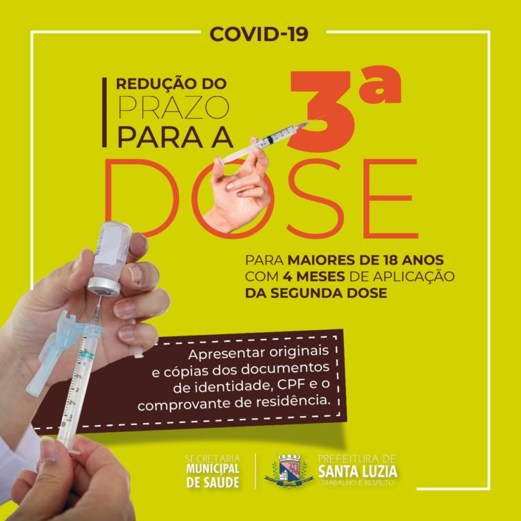 Desde o início desta semana, o município de Santa Luzia reduziu o prazo para aplicação da dose de reforço da vacina contra a covid-19. Agora, pessoas com mais de 18 anos e que tenham completado 4 meses desde a aplicação da segunda dose do imunizante já podem procurar a unidade de saúde de referência para receber a dose de reforço. A medida visa inibir a transmissão da nova variante ômicron.