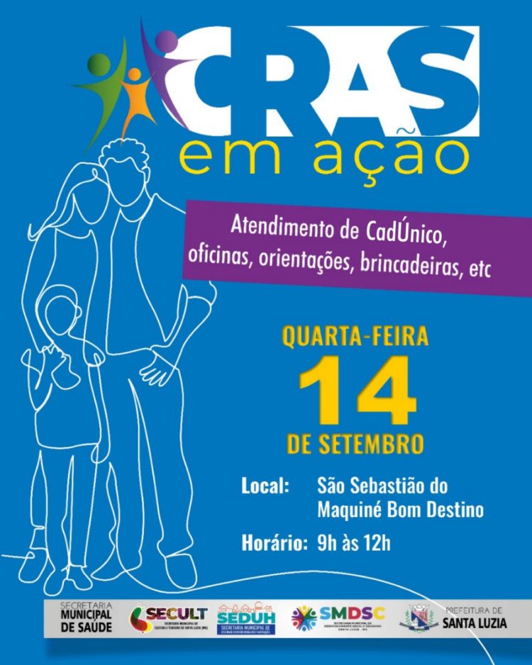 Na próxima quarta (14), a Prefeitura de Santa Luzia promoverá, por intermédio da Secretaria de Desenvolvimento Social e Cidadania, uma ação itinerante – o CRAS em Ação – na comunidade de São Sebastião do Maquiné, no bairro Bom Destino, a qual disponibilizará à população inúmeros serviços, como atendimento de CadÚnico, escuta social e atividades do Serviço de Convivência e Fortalecimento de Vínculos, dentre outros. A ação acontecerá das 9h às 12h.