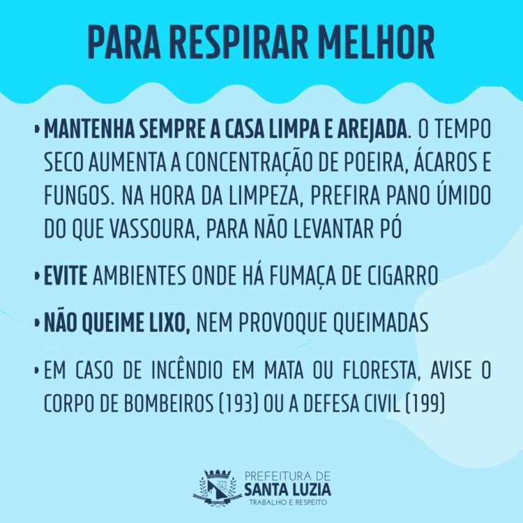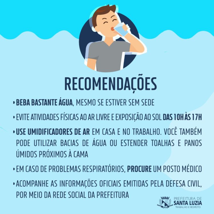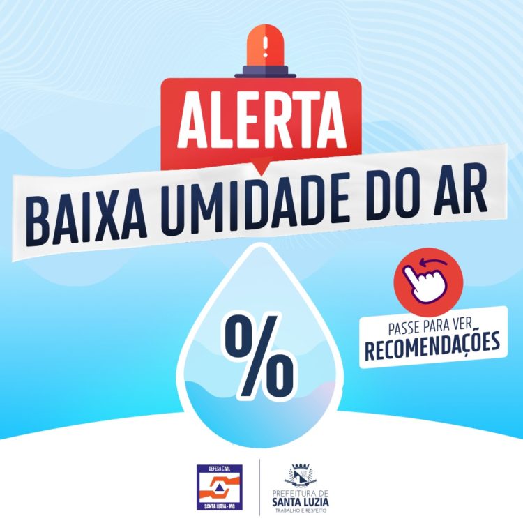 A Defesa Civil Municipal de Santa Luzia alerta a população para a presença de uma massa de ar seco, que deixa os índices de umidade relativa do ar baixos, nos próximos dias, principalmente no período da tarde. A previsão é que a umidade relativa do ar fique entre 21% e 30% no município.