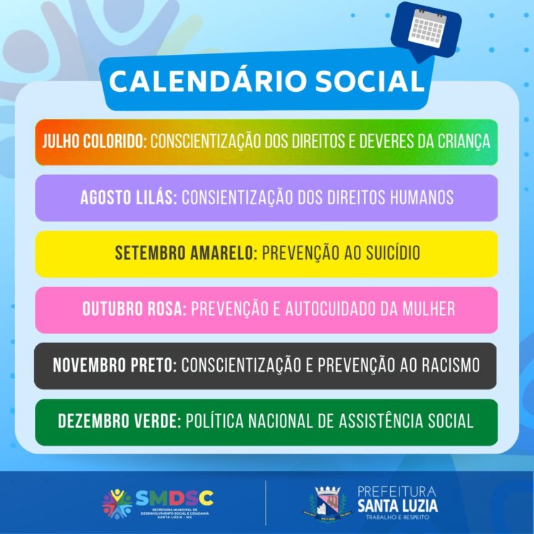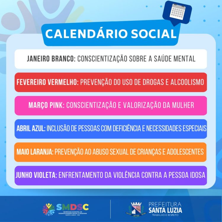 A Prefeitura de Santa Luzia, através da Secretaria Municipal de Desenvolvimento Social e Cidadania (SMDSC), divulga oficialmente o Calendário Social, que norteará as principais ações durante o ano de 2023.
