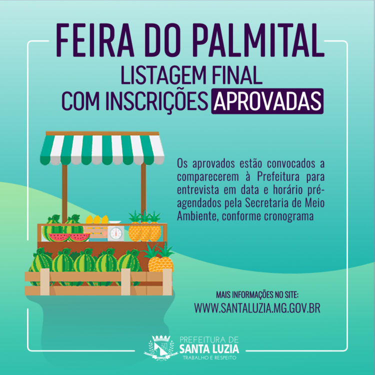 A Prefeitura de Santa Luzia, por meio da Secretaria Municipal de Meio Ambiente, Agricultura e Abastecimento divulgou, nesta terça-feira (19), a listagem final das inscrições aprovadas para a Feira do Palmital.