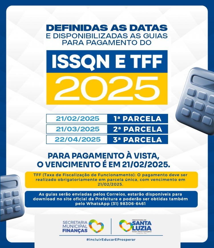 A Prefeitura de Santa Luzia anunciou as datas e a disponibilidade das guias para o pagamento do Imposto Sobre Serviços de Qualquer Natureza (ISSQN) e da Taxa de Fiscalização de Funcionamento (TFF) referentes ao exercício de 2025.