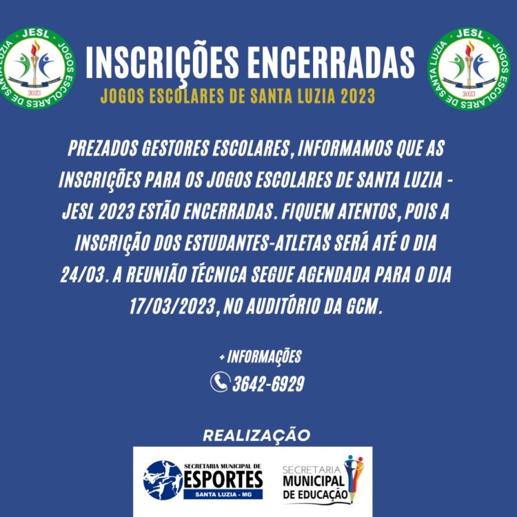 A secretaria municipal de Esporte informa aos gestores de escolas situadas na cidade, que as inscrições para os Jogos Escolares de Santa Luzia (JESL) 2023 estão encerradas. A inscrição dos estudantes / atletas estará aberta até o dia 24 de março, portanto, fiquem atentos.