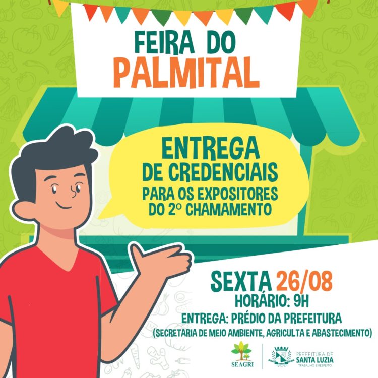 A Prefeitura de Santa Luzia, por meio da Secretaria Municipal de Meio Ambiente, Agricultura e Abastecimento, entregará nesta sexta-feira (26), às 9h, as credenciais para os expositores aprovados no segundo chamamento público para a Feira do Palmital. Na mesma data haverá o sorteio para o local de trabalho dos aprovados nesta segunda fase. A entrega será na sede da secretaria (prédio da Prefeitura, Avenida Oito, 50 – Frimisa).