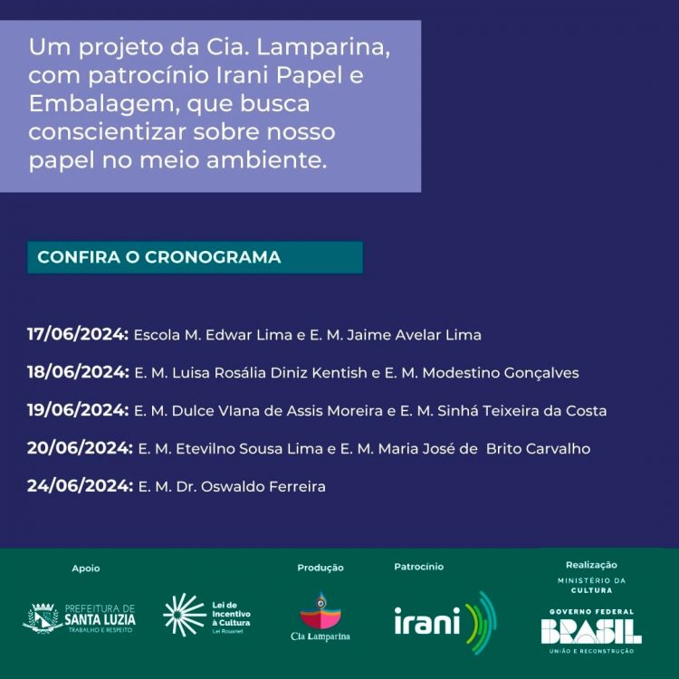 Cinco escolas municipais de Santa Luzia receberão a apresentação teatral do espetáculo “Piratas navegando no Rio das Velhas em uma missão inesperada: Conter a poluição do rio”. O projeto foi idealizado e realizado pela Cia. Lamparina, surgindo da inquietação dos integrantes da companhia e da preocupação com questões ambientais. As apresentações se iniciam nesta segunda-feira na Escola Municipal Edwar Lima e Escola Municipal Jaime Avelar Lima. O cronograma de apresentação segue até a próxima segunda-feira, dia 24 de junho.