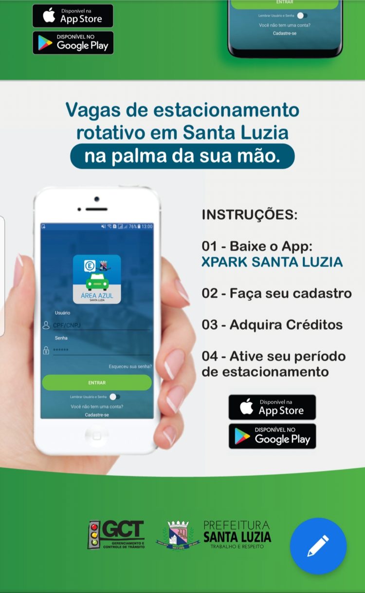 Por enquanto, o estacionamento rotativo está implantado apenas na Av. Brasília, entre o Portal São Benedito e a Rua Virginópolis. Para estacionar, o usuário deve baixar o aplicativo “xpark santa luzia” (disponível para Android 4.1 ou superior através do Google Play ou iOS pelo AppStore) e efetuar a compra do ticket ou ir até um dos pontos de venda já credenciados pela Prefeitura, na Av. Brasília nºs 735, 1840, 2261 e 2269.
